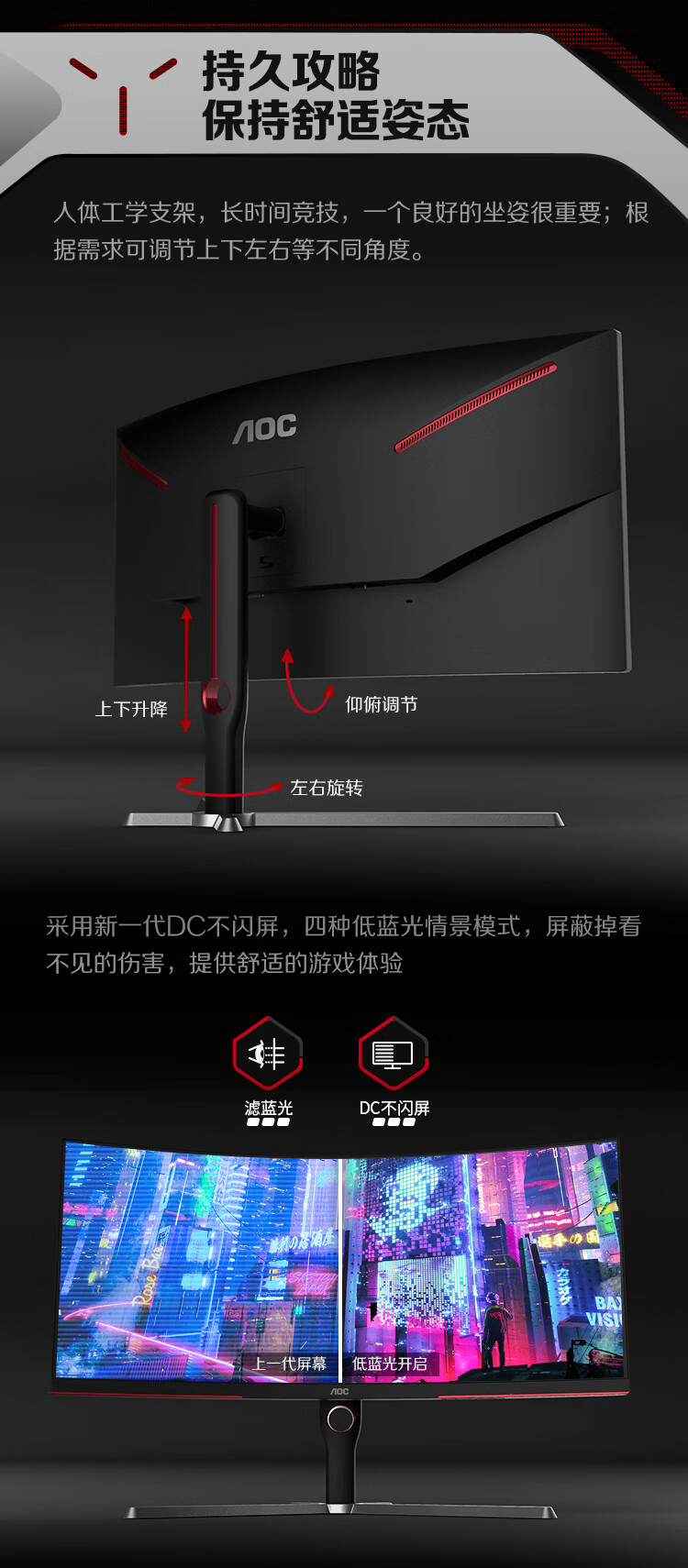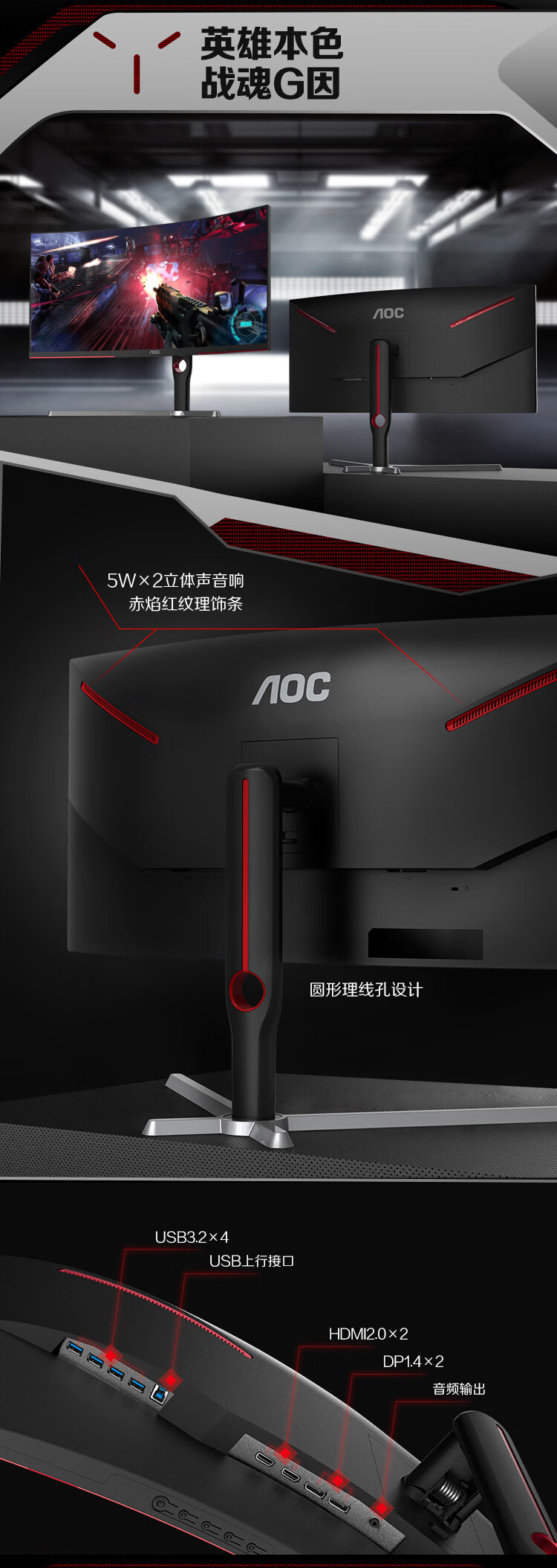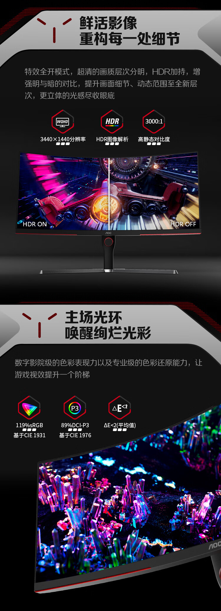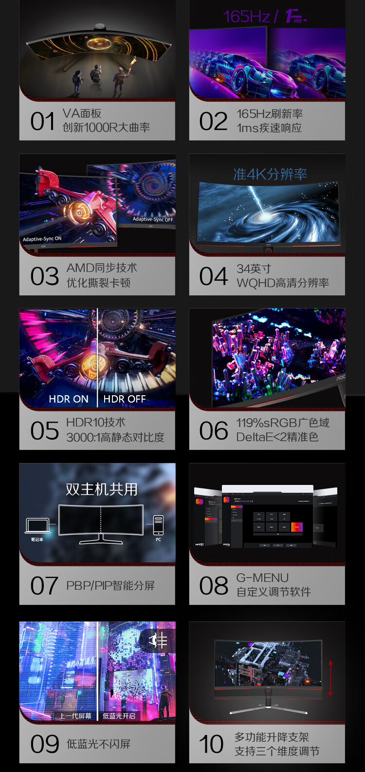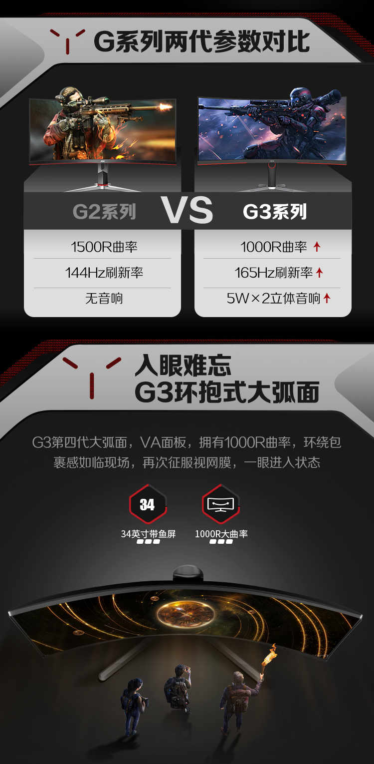 AOC34英寸带鱼屏WQHD1000R广色域165HzHDR10出厂校色旋转升降21:9电竞曲面显示器CU34G3S